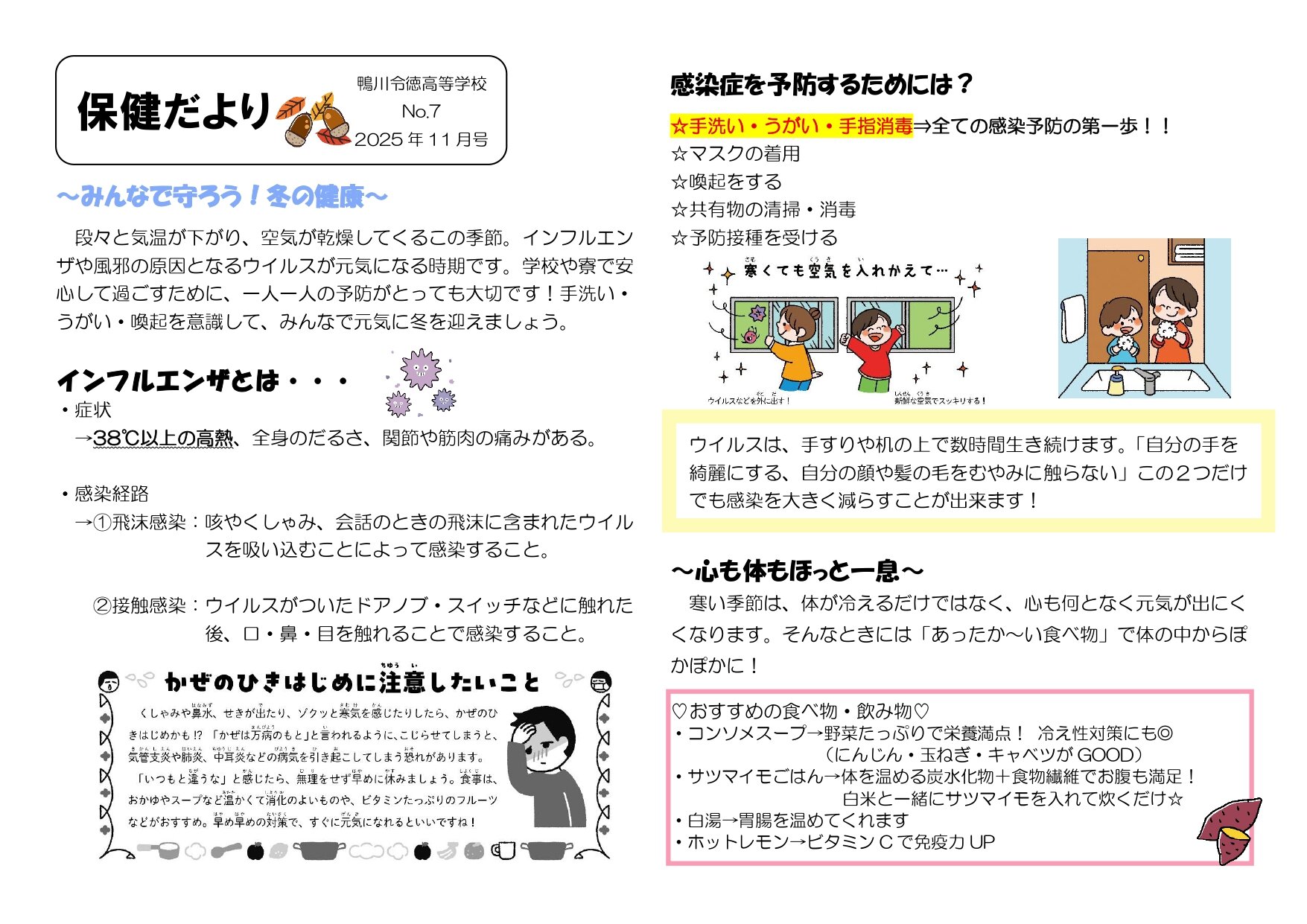 最近はインフルエンザが流行しているので、感染予防対策をしっかりお願いします。今月は保健だよりをブログで配信していなかったので、ここに載せます。テーマはインフルエンザについてと「心も体も一息(おすすめな飲み物・食べ物)」です。