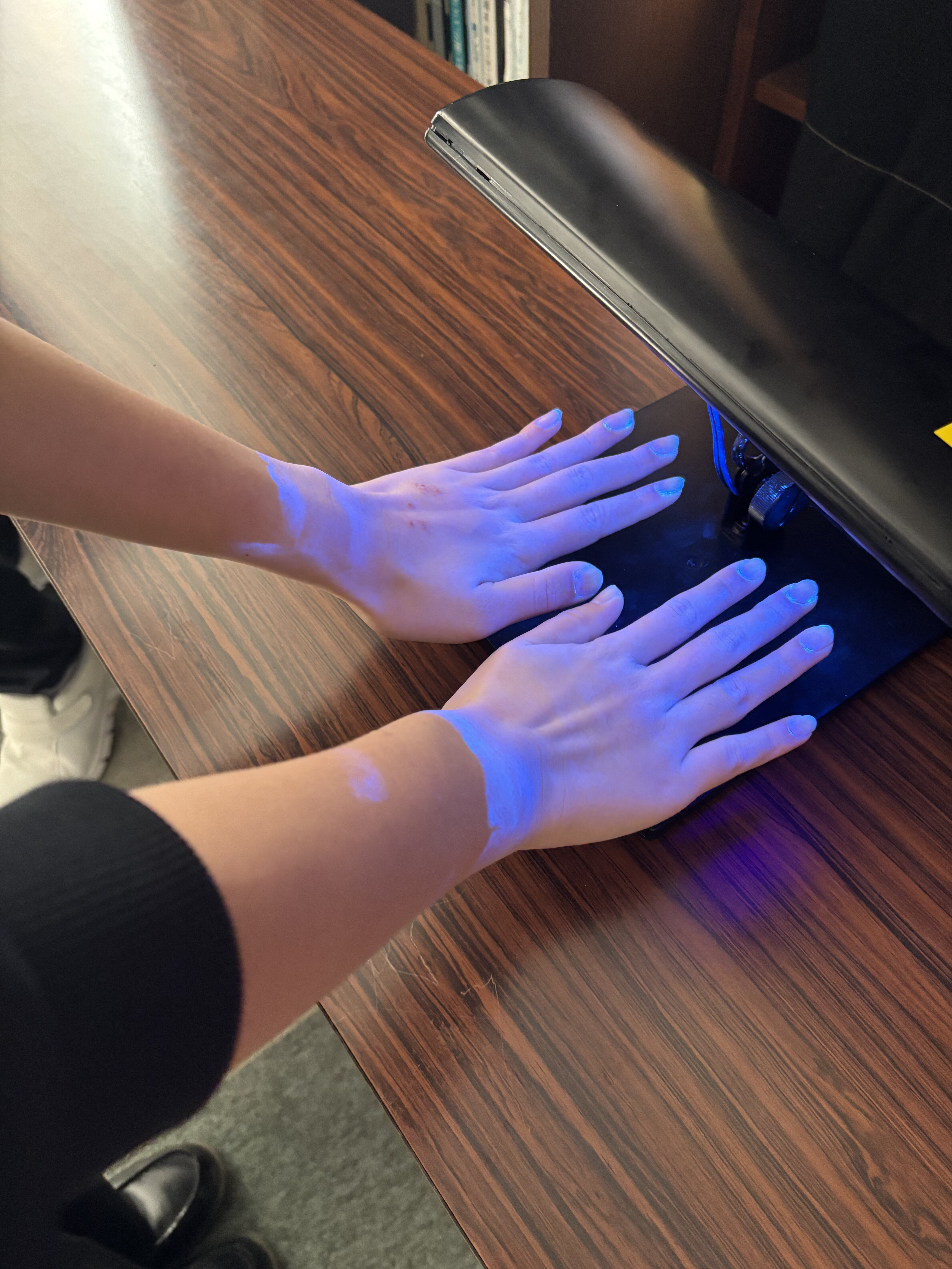 まず手指衛生では、手洗いの意味や必要性について学び、実際に手洗いをしてブラックライトで確認!