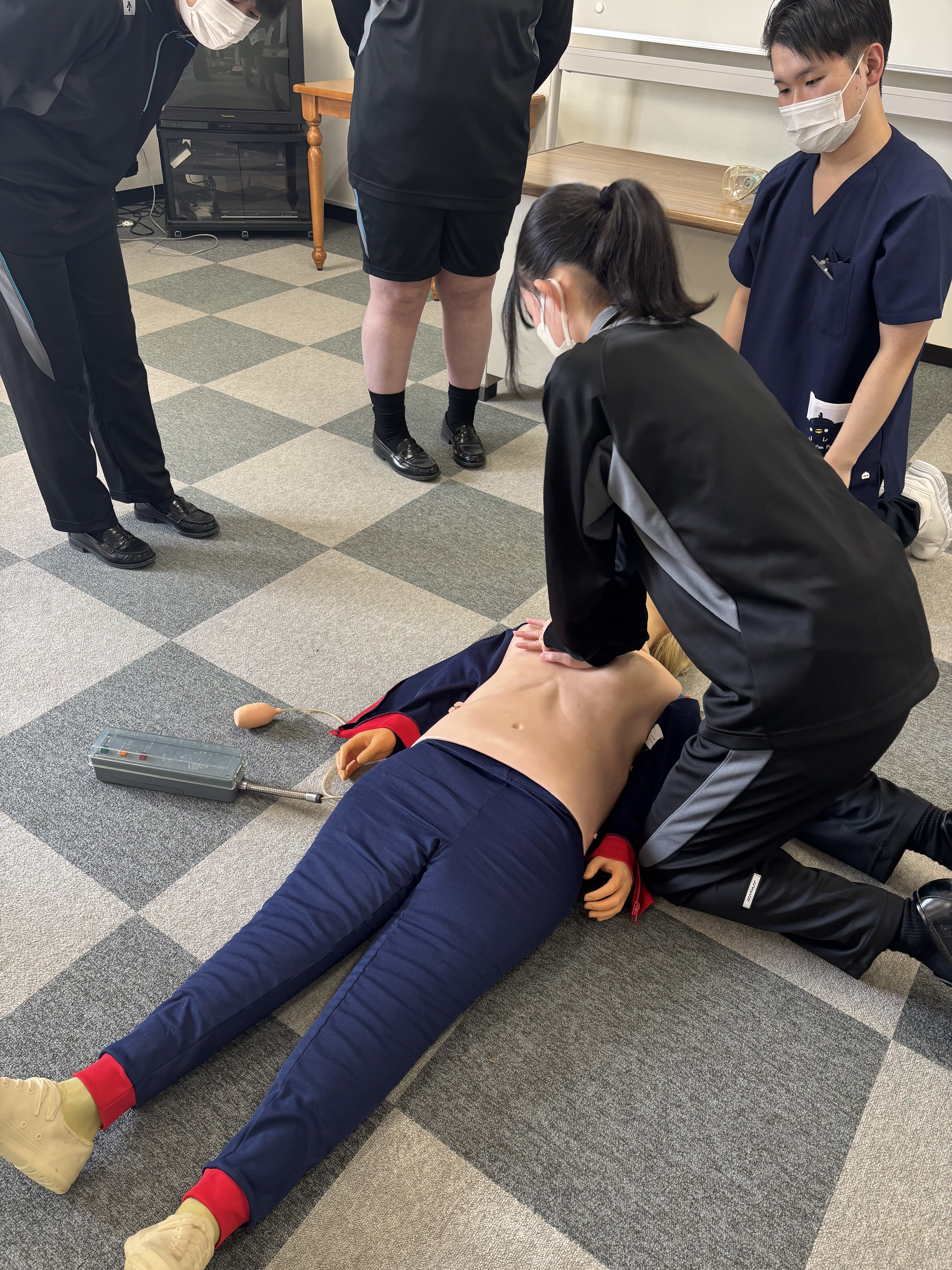 心肺蘇生法では、人形を使って胸骨圧迫を体験。いざという時に命を守る行動ができることの大切さを学びました。